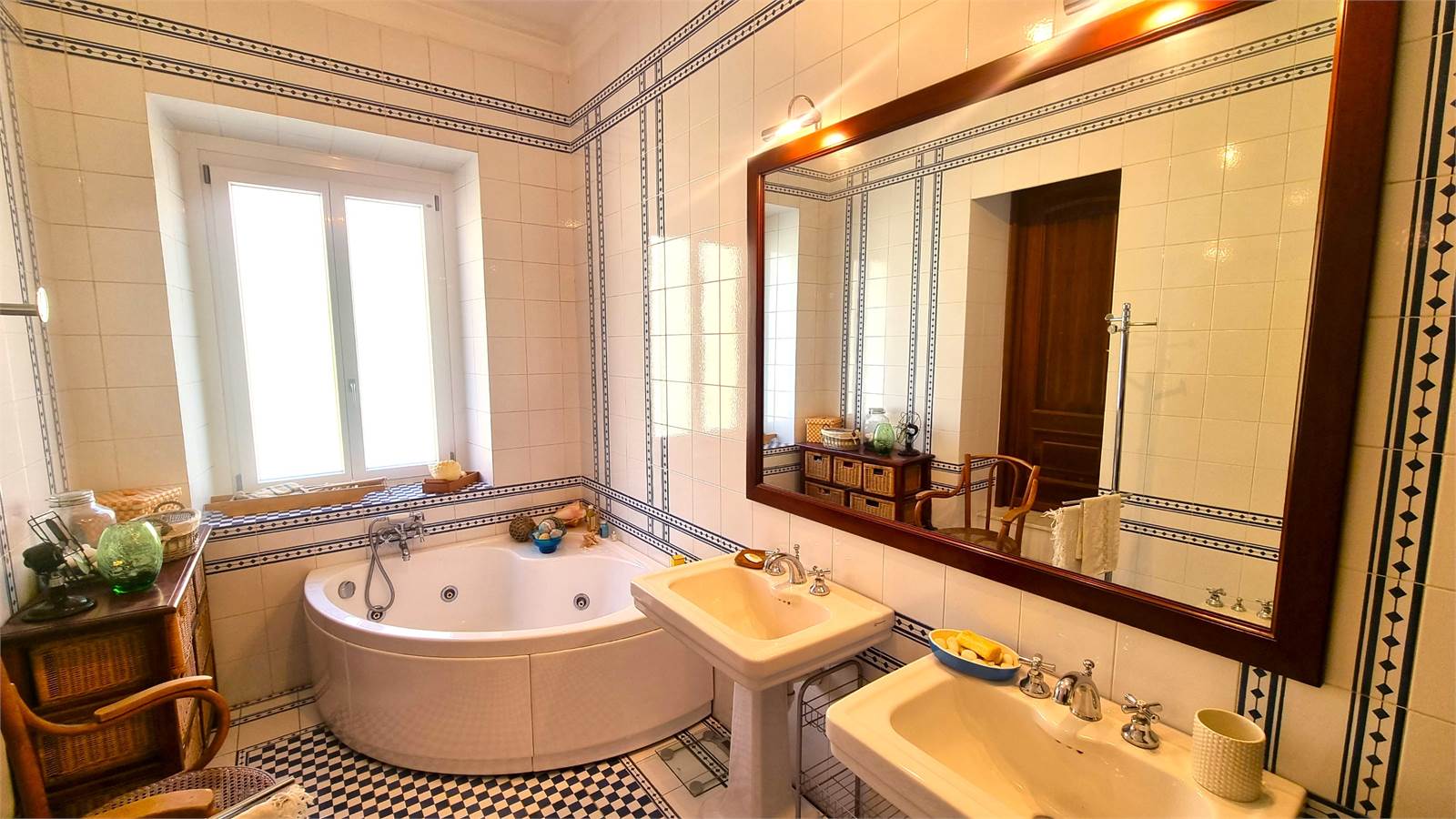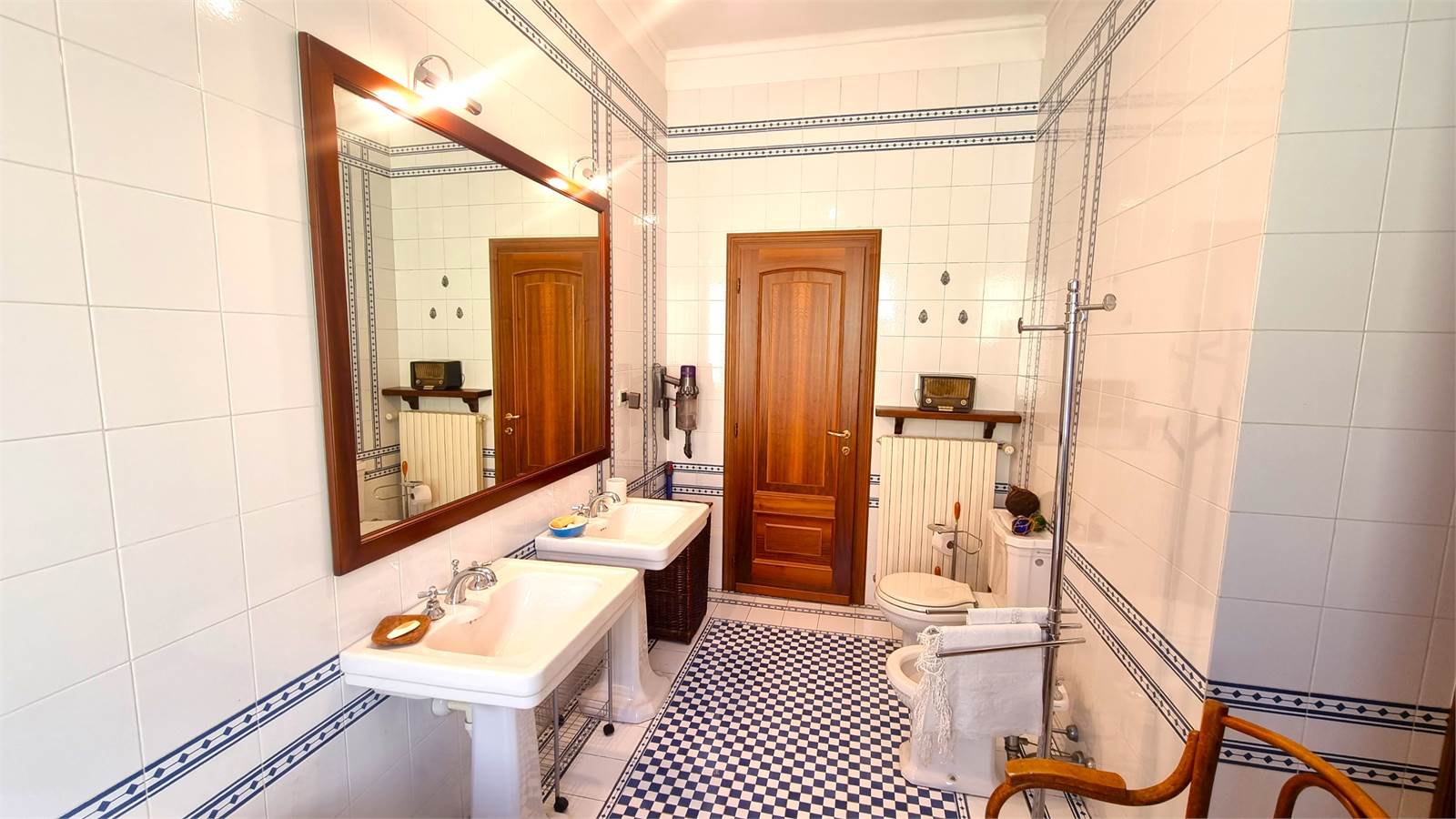 L'appartamento al primo piano si compone di un ingresso living su una sala con camino, una cucina abitabile, un corridoio di disimpegno, una lavanderia, due bagni di cui uno dotato di doccia e uno di vasca con idromassaggio, due camere da letto, uno studio, tre balconi, oltre a un sottotetto, in parte adibito a solaio grezzo mentre in una parte è stata realizzata una saletta relax con sauna.