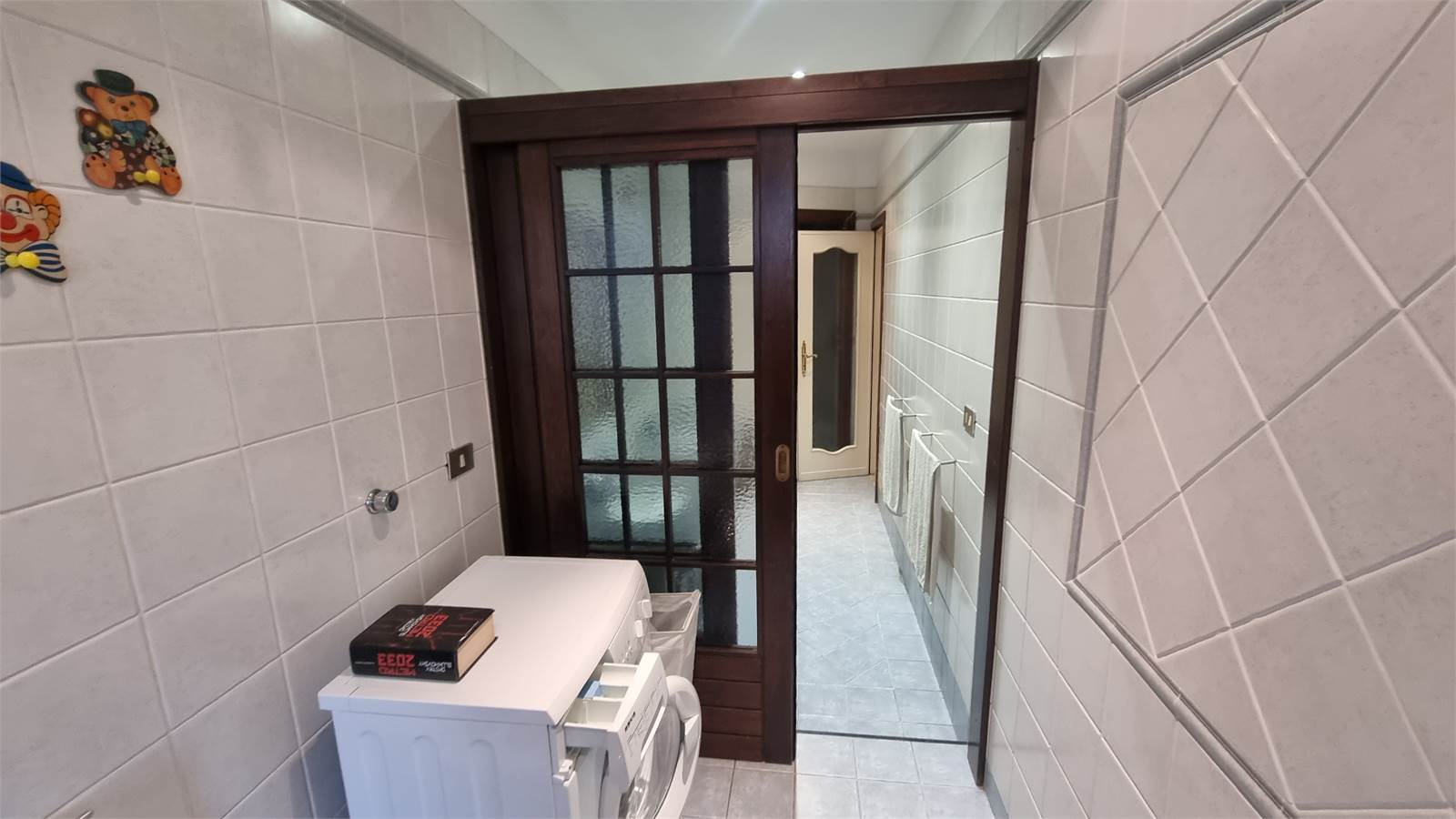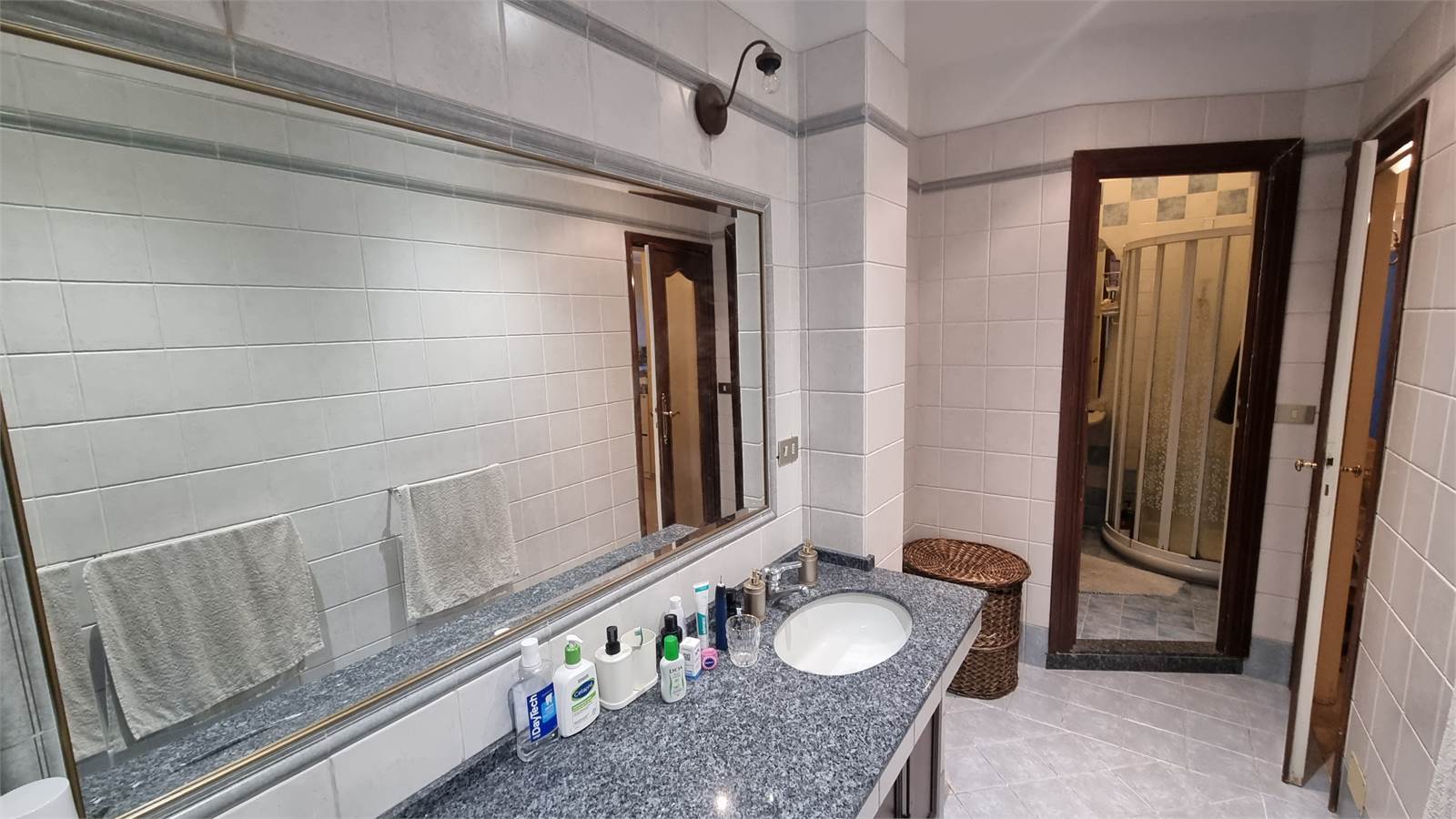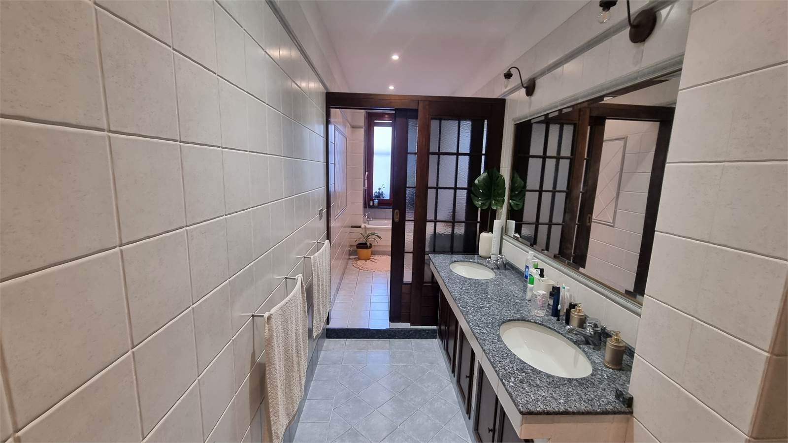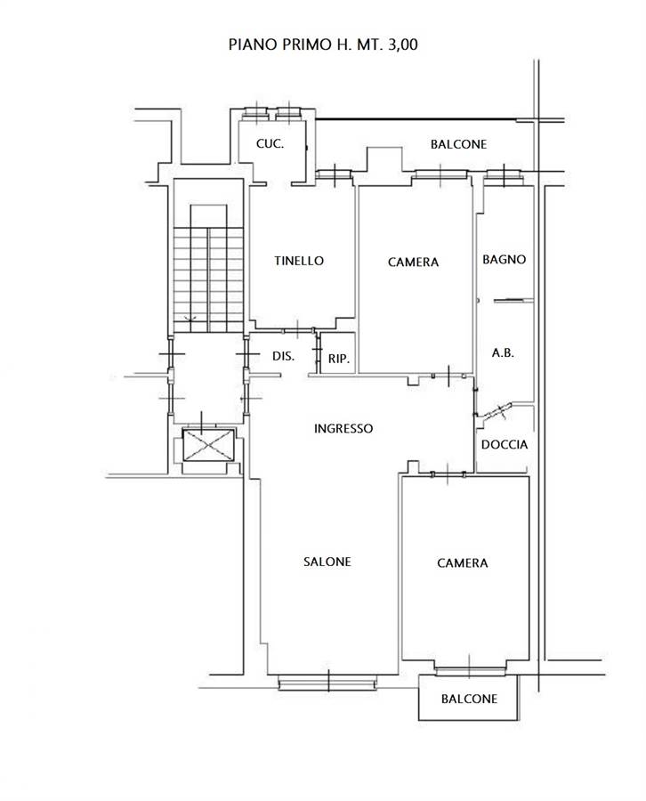 L'appartamento si compone di un ampio ingresso living su un salone, un tinello con cucinino, un disimpegno, due camere da letto matrimoniali pavimentate con parquet, un bagno doppio costituito da un antibagno, il bagno principale con la vasca e il bagno secondario con lavabo e box doccia.