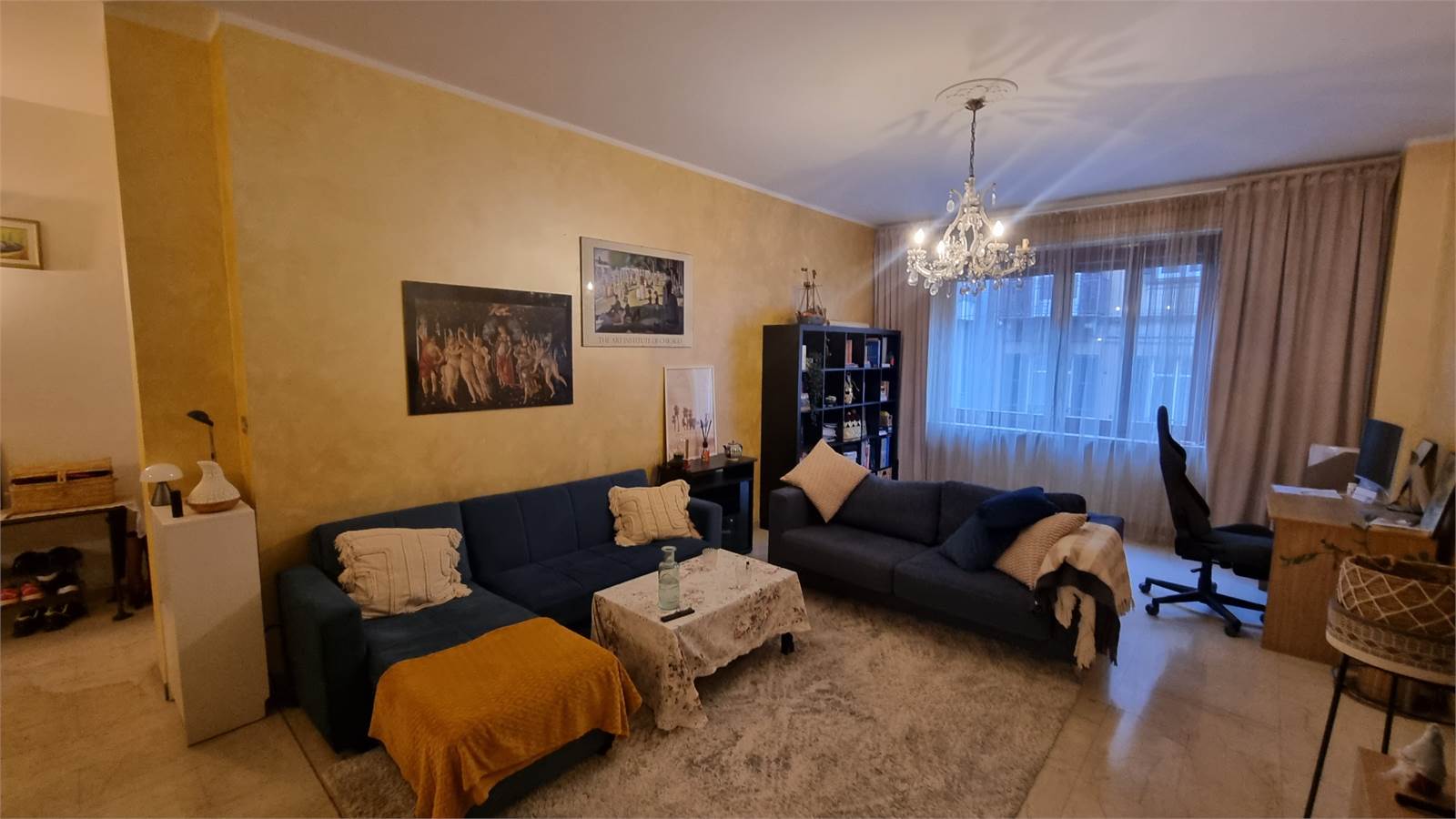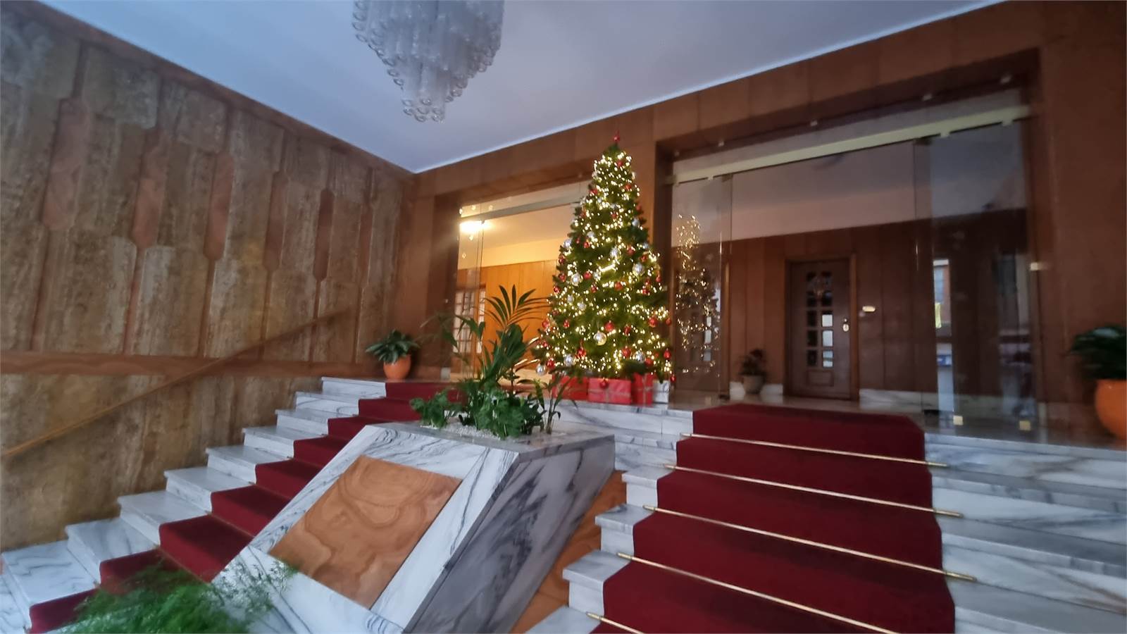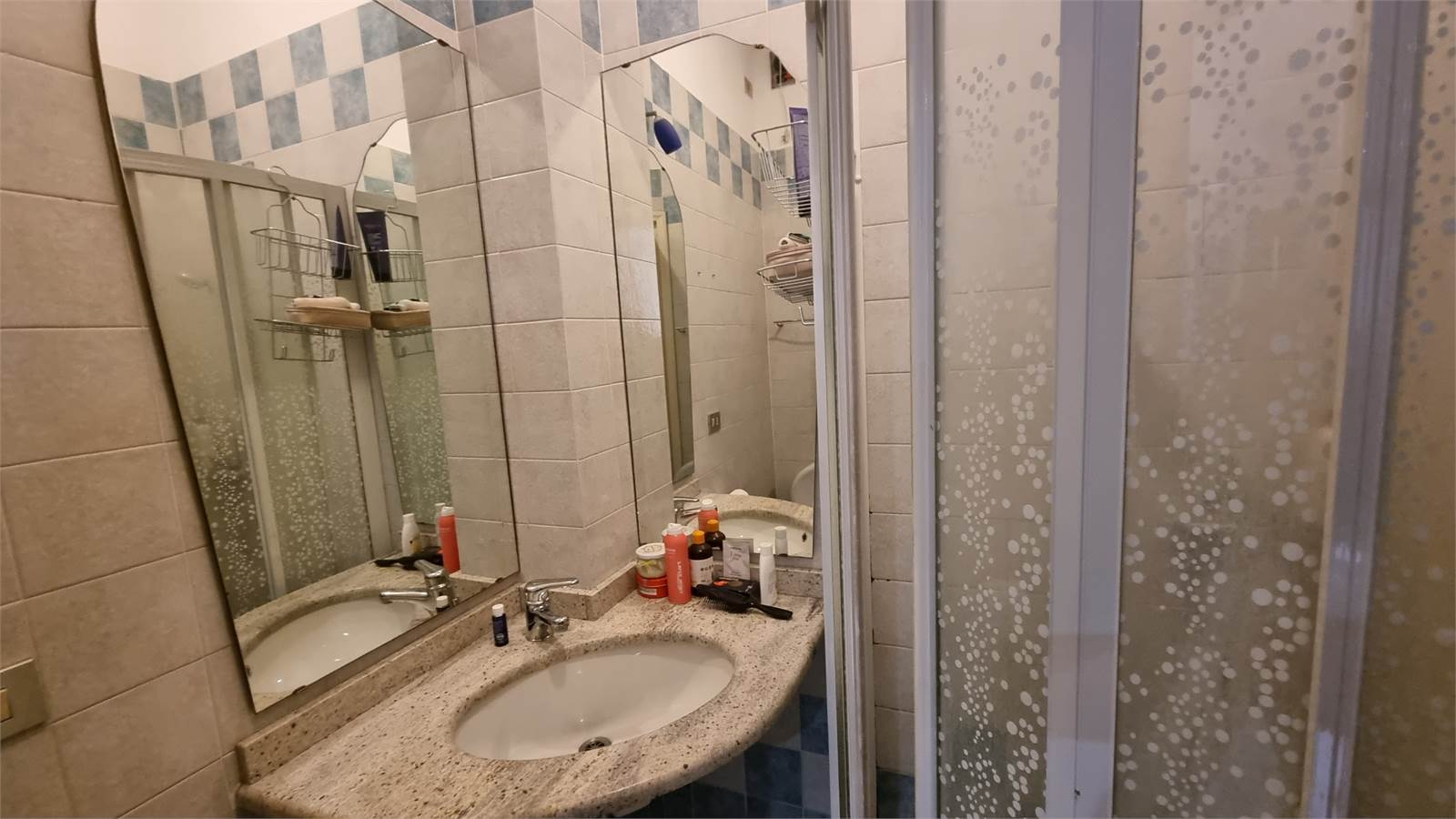 L'appartamento si compone di un ampio ingresso living su un salone, un tinello con cucinino, un disimpegno, due camere da letto matrimoniali pavimentate con parquet, un bagno doppio costituito da un antibagno, il bagno principale con la vasca e il bagno secondario con lavabo e box doccia.